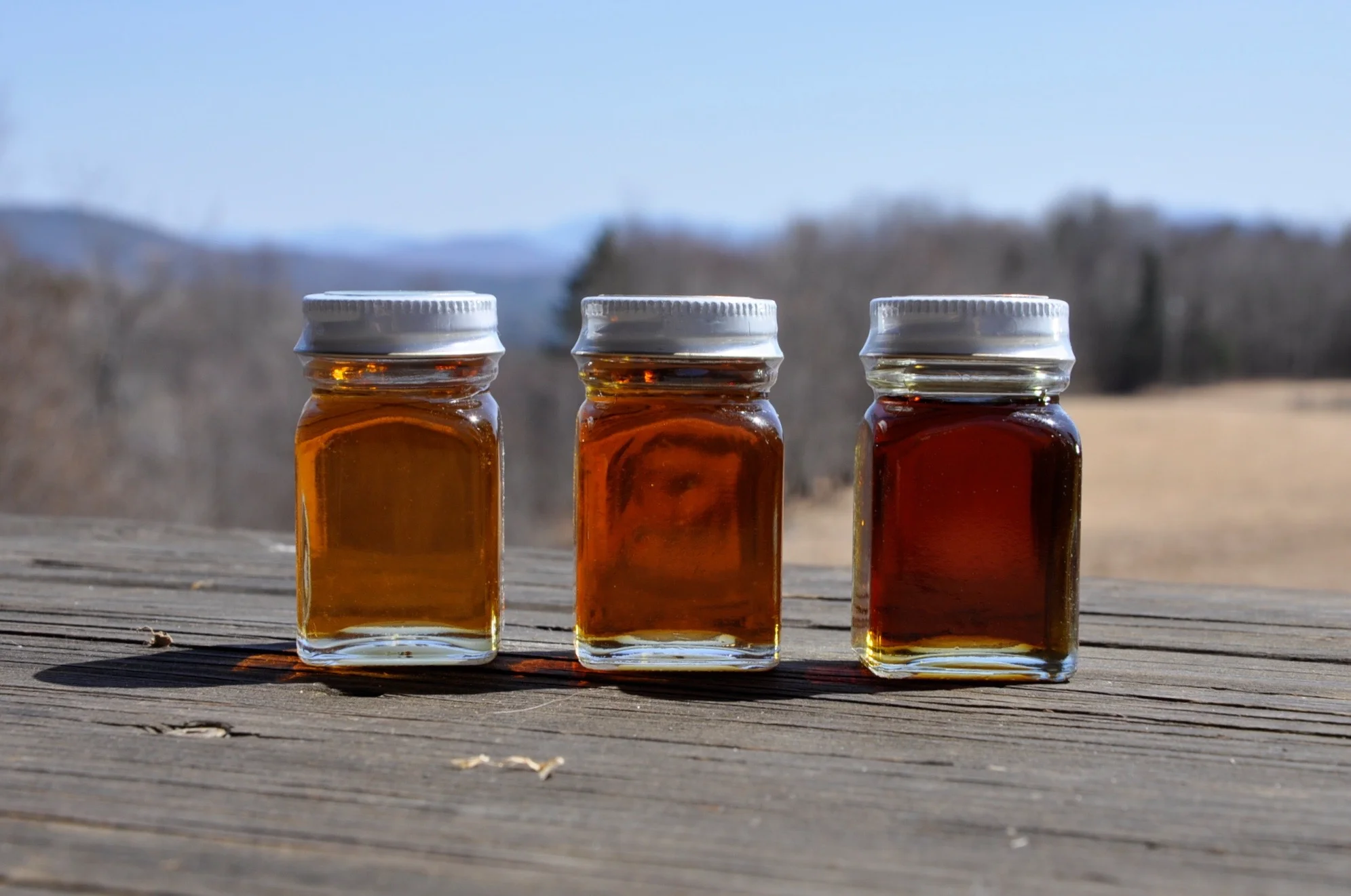 Our sugar maples yield sap that process into three grades of syrup: Golden Delicate; Grade Amber Color - Rich Taste and Grade A Dark - Robust Taste. Though syrup in each bottle above may appear to vary by color, but all four bottles contain "Amber Color - Rich Taste". The syrup in the varying-sized bottles catches light according to its depth. Every season varies according to the whim of the sugar maples and all the imaginable natural variables.