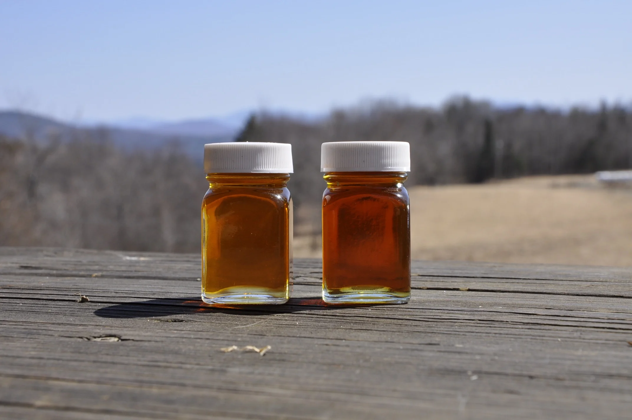 Our syrup falls into 2 grades this year: Grade A Amber Color, Rich Taste Maple Syrup (left) and Grade A Dark Color, Robust Taste Maple Syrup (right).